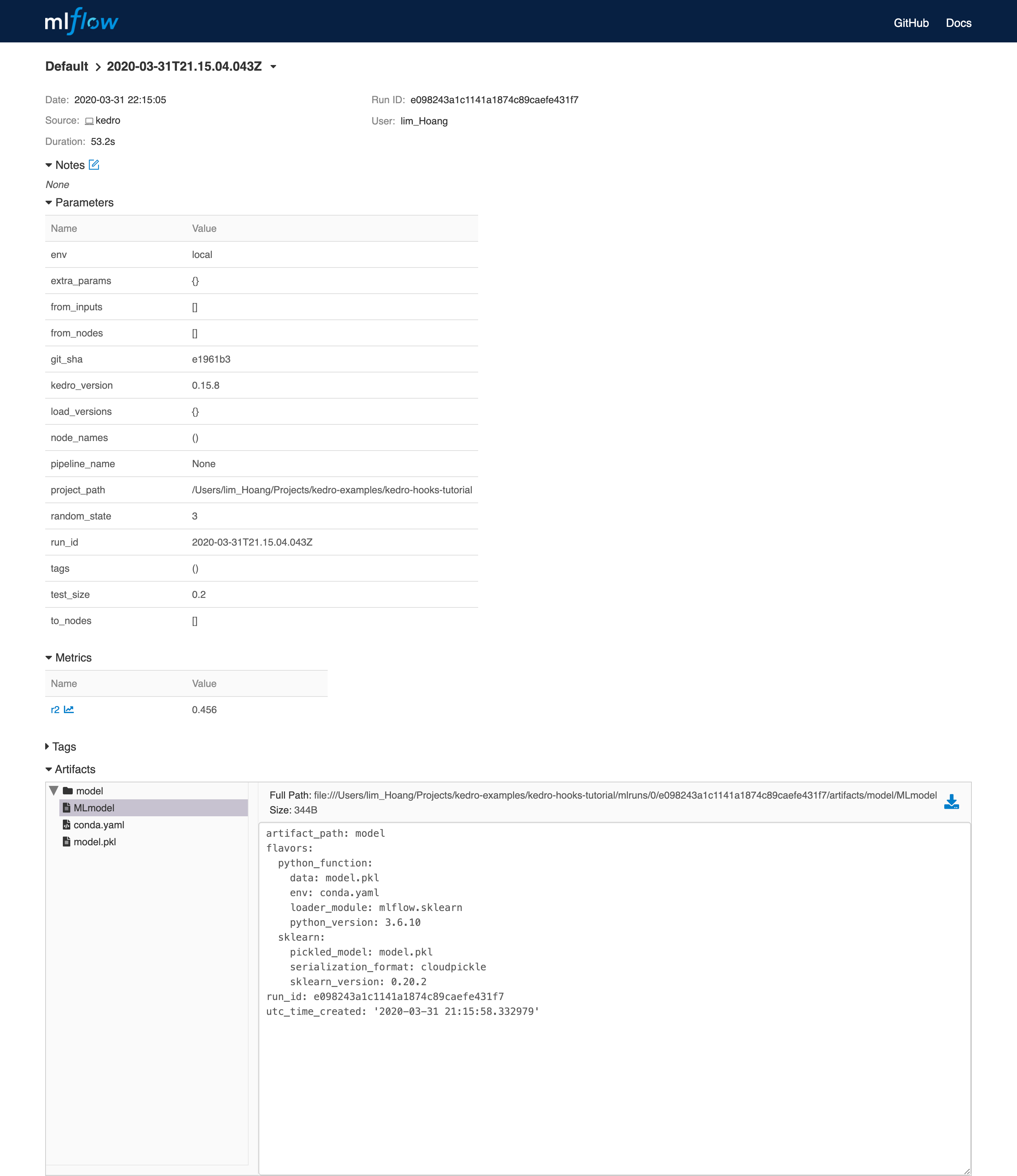 before_pipeline_run,after_pipeline_runandafter_node_runHooks to collect metrics usingMLflow:
