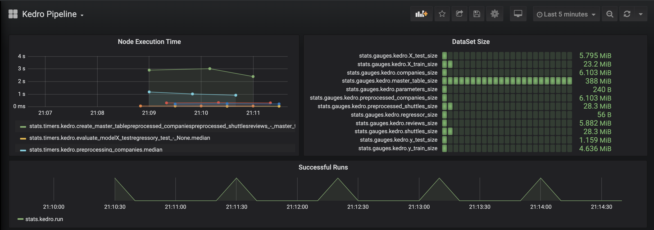 This example adds observability to your pipeline using statsd and makes it possible to visualise dataset size and node execution time using Grafana.